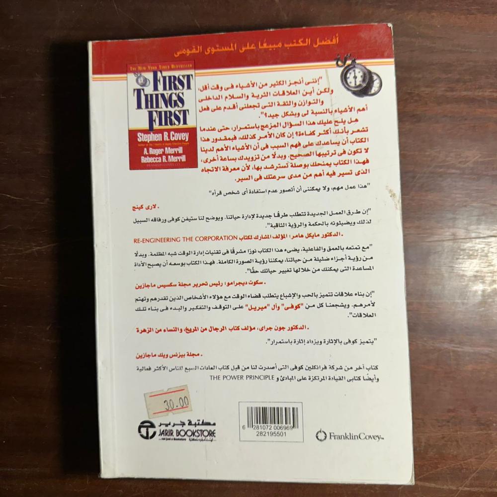 اسم الكتاب :الأشياء الأولى أولاً اسم الكاتب:ستيفن ر.كوفيدار النشر :مكتبة جريرتاريخ النشر :2013عدد الصفحات :453a.3